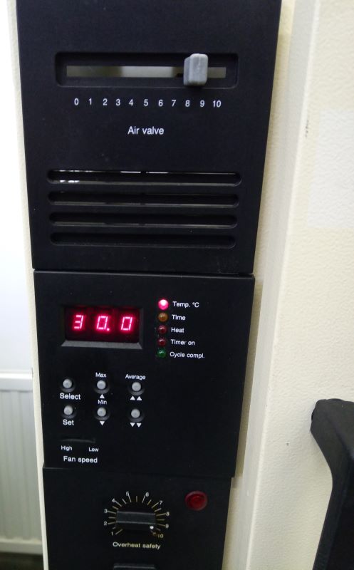 Dit exemplaar is gebruikt voor incubaties bij 30°C, en het is me niet gelukt de temperatuur hoger in te stellen. Lager kan wel. Wellicht is dit te veranderen door de begrenzing te verhogen, maar ik heb geen handleiding en weet niet of dit kan.
