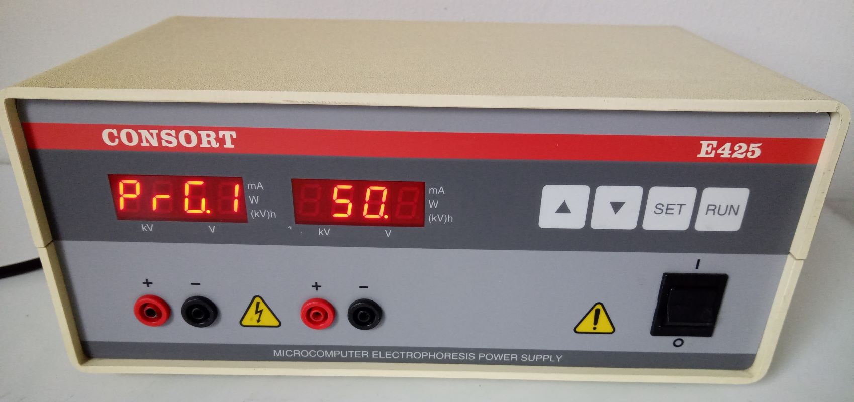 The Consort E425 electrophoresis power supply can supply 2 – 200 V and 5 – 500 mA, dual in parallel, floating. Minimum load (resistance) is 10 Ω.