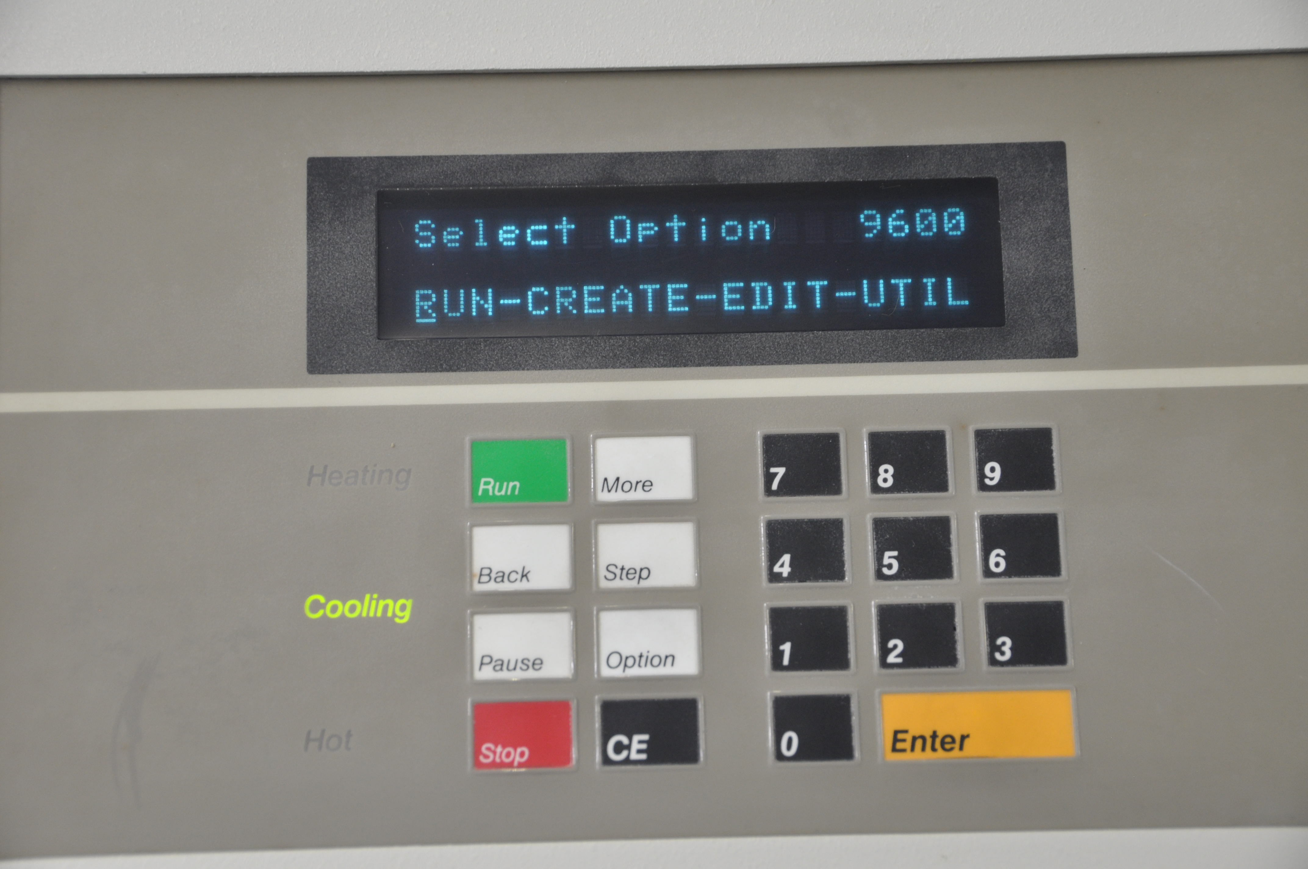 The GeneAmp PCR System 9600 contains a programmable heating and cooling block, which rapidly and uniformly heats and cools PCR samples. The sample compartment can hold 96 MicroAmp Reaction Tubes (0.2 ml) in an 8 x 12 array. Users can store up to 150 PCR protocols.