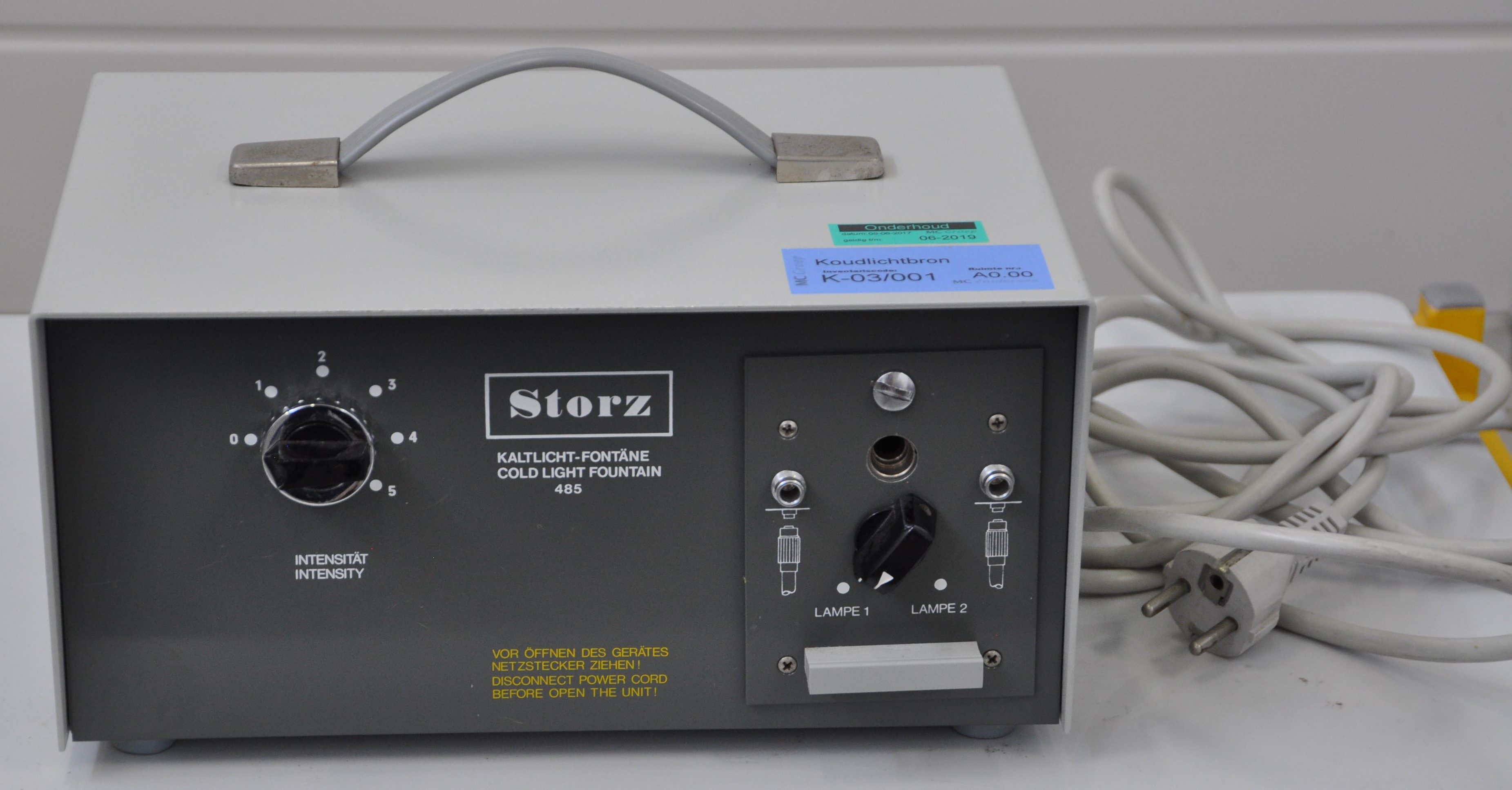 Storz 485B koudlichtbron voor endoscopie. De bron heeft twee lampen en vijf intensiteitsniveaus.