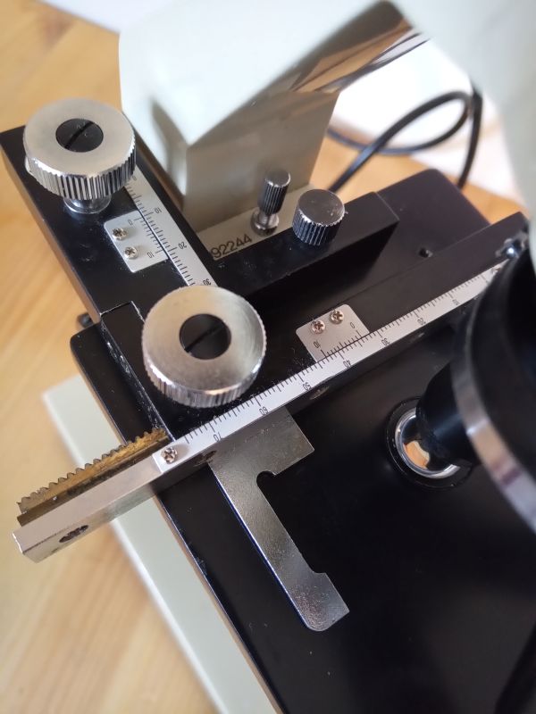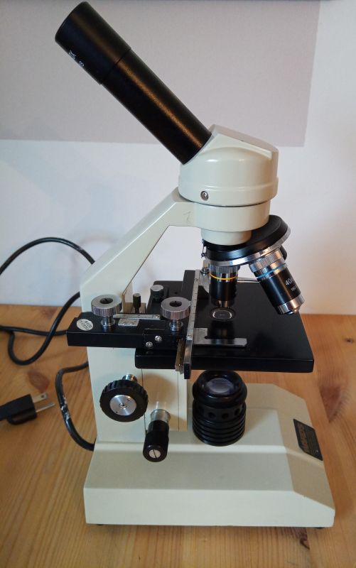 Ward microscope with mechanical stage and illumination. Enlargement 40x, 100x, 400x. Ocular with pointing arrow.