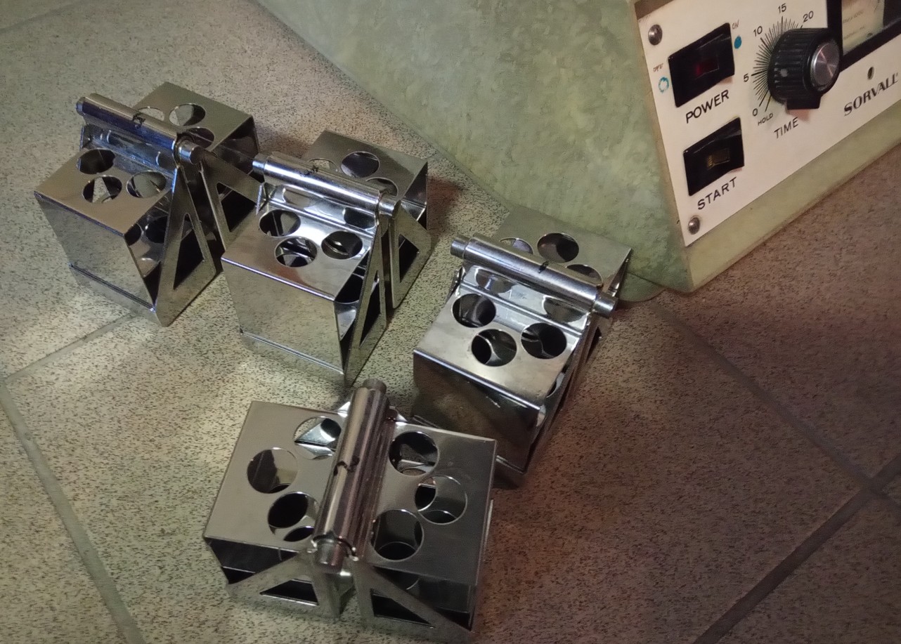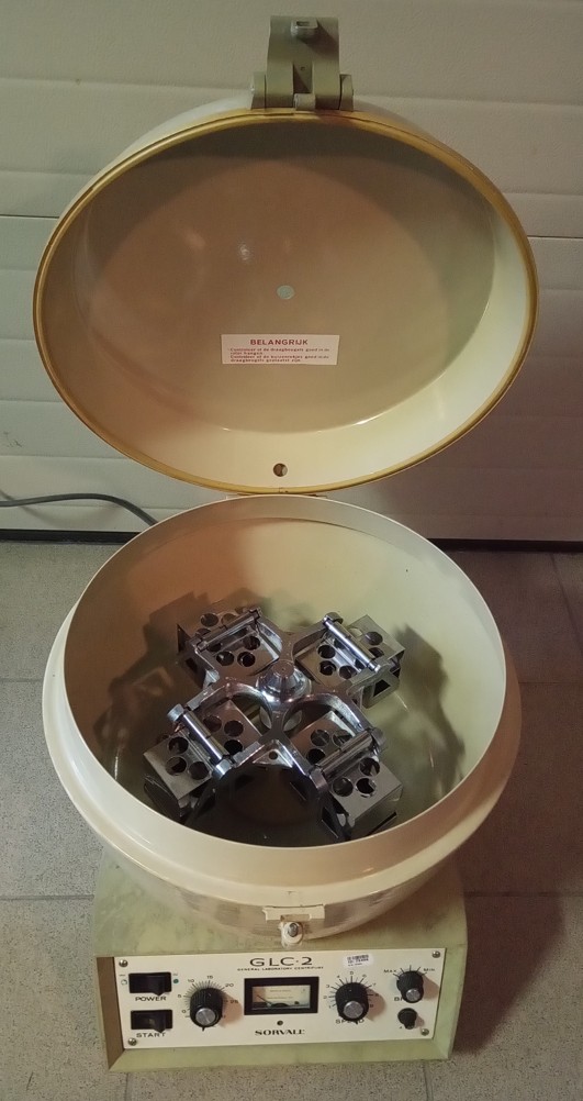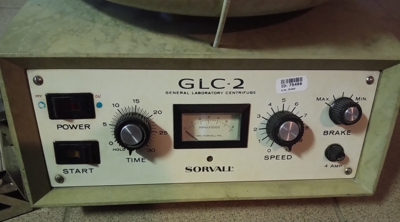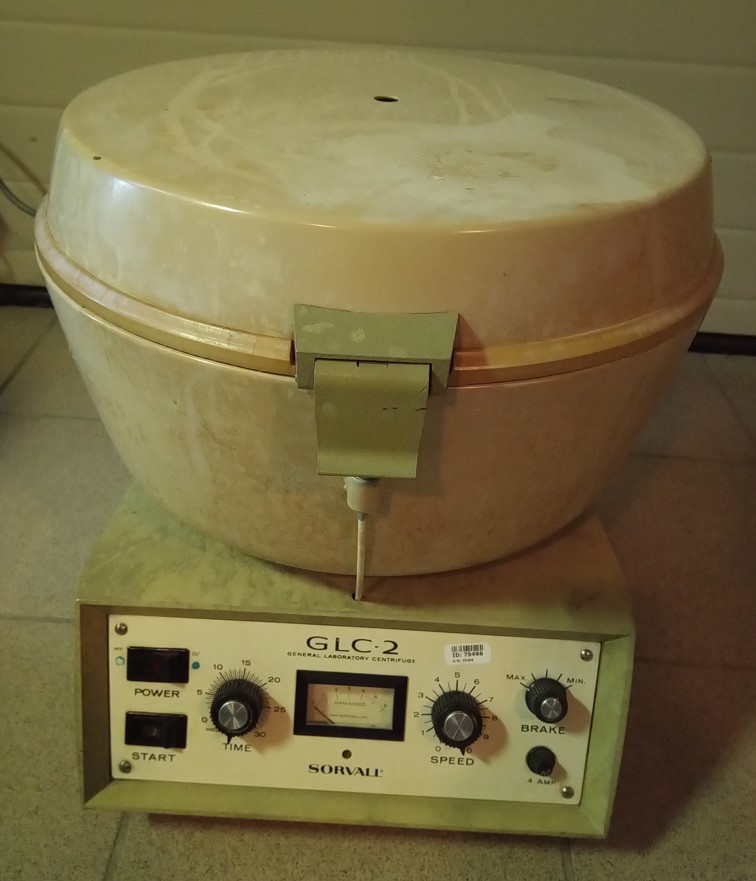 Vintage Sorvall GLC-2 centrifuge with 4-position swing-out rotor and two sets of four buckets each: one set 513/539 and one set 565/598. Power requirements 220V, 50 Hz. Note that the maximum speed is approximately 2600 rpm.