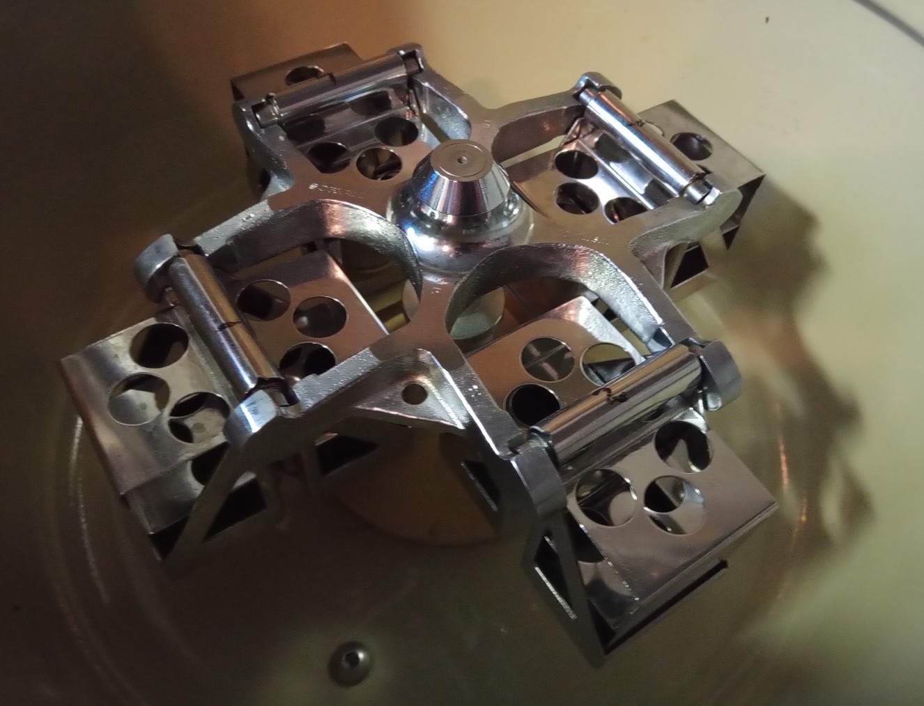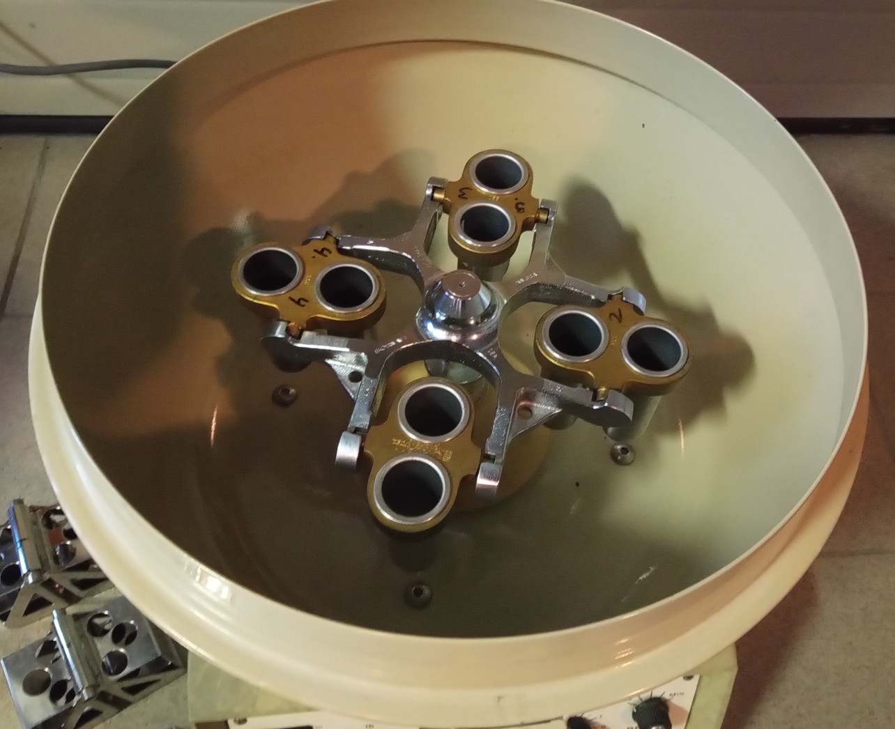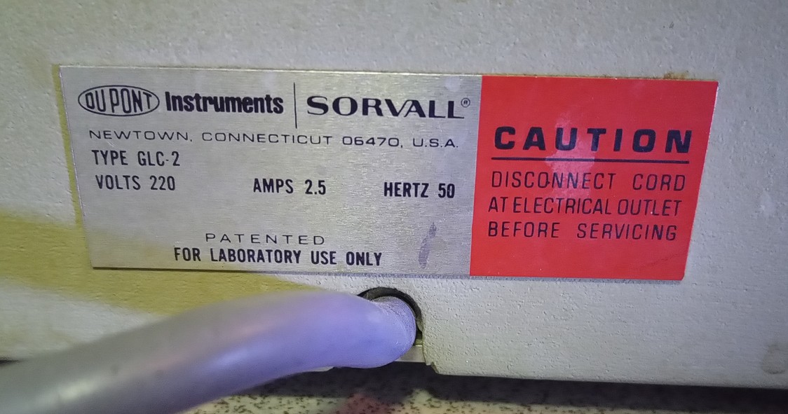 Vintage Sorvall GLC-2 centrifuge with 4-position swing-out rotor and two sets of four buckets each: one set 513/539 and one set 565/598. Power requirements 220V, 50 Hz. Note that the maximum speed is approximately 2600 rpm.